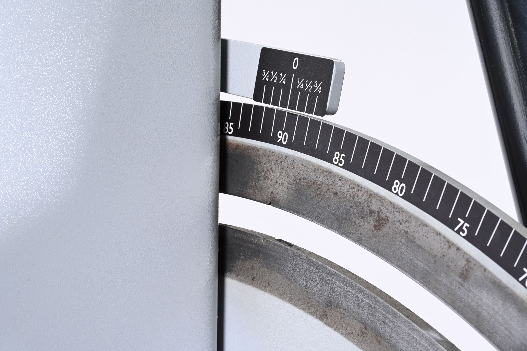 Semi-automatic vertical band saw with the ability to miter from 60° left to 60° right.